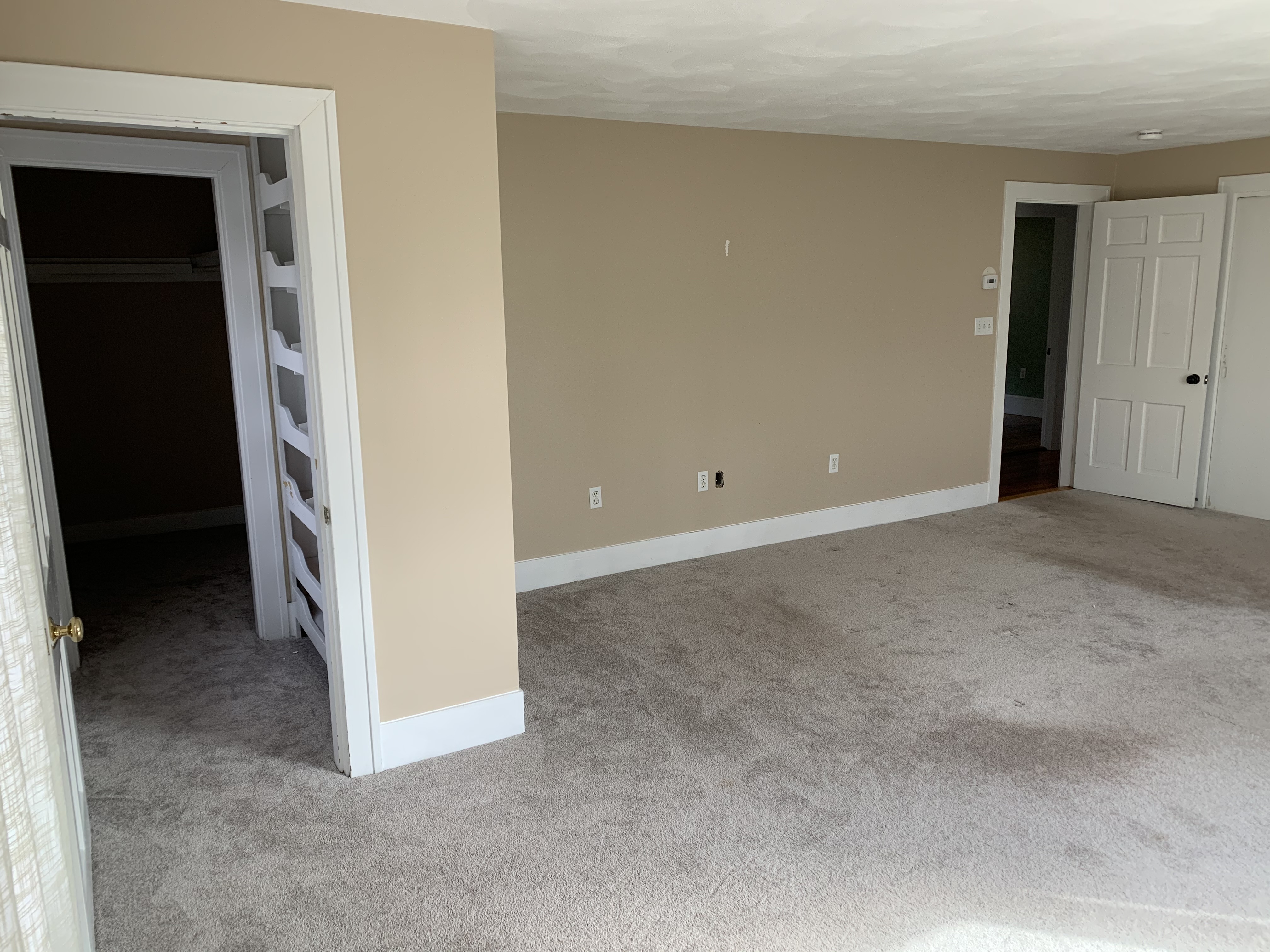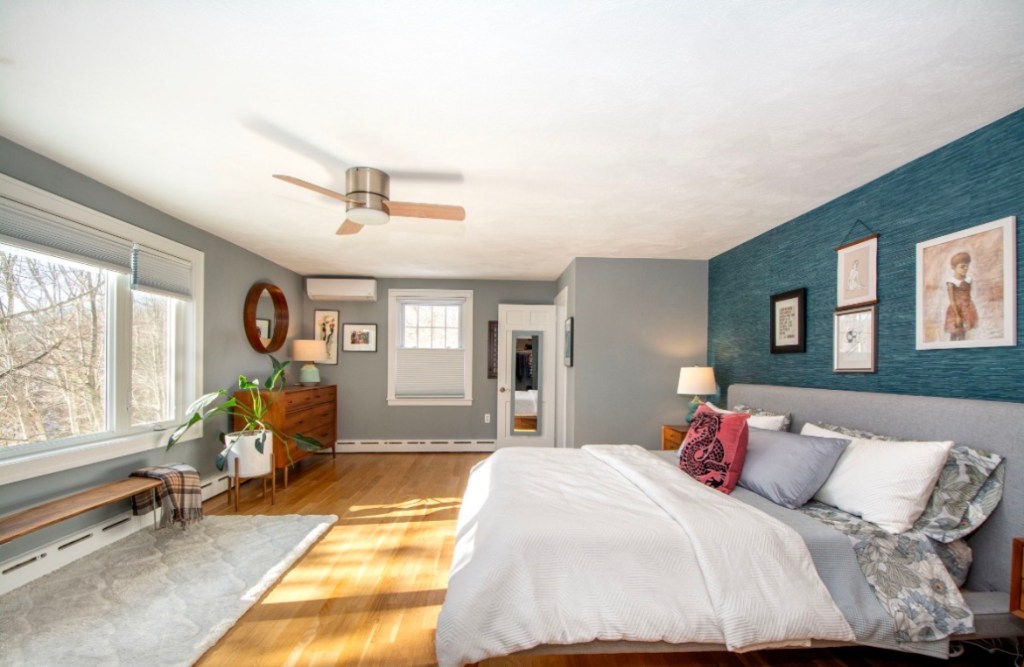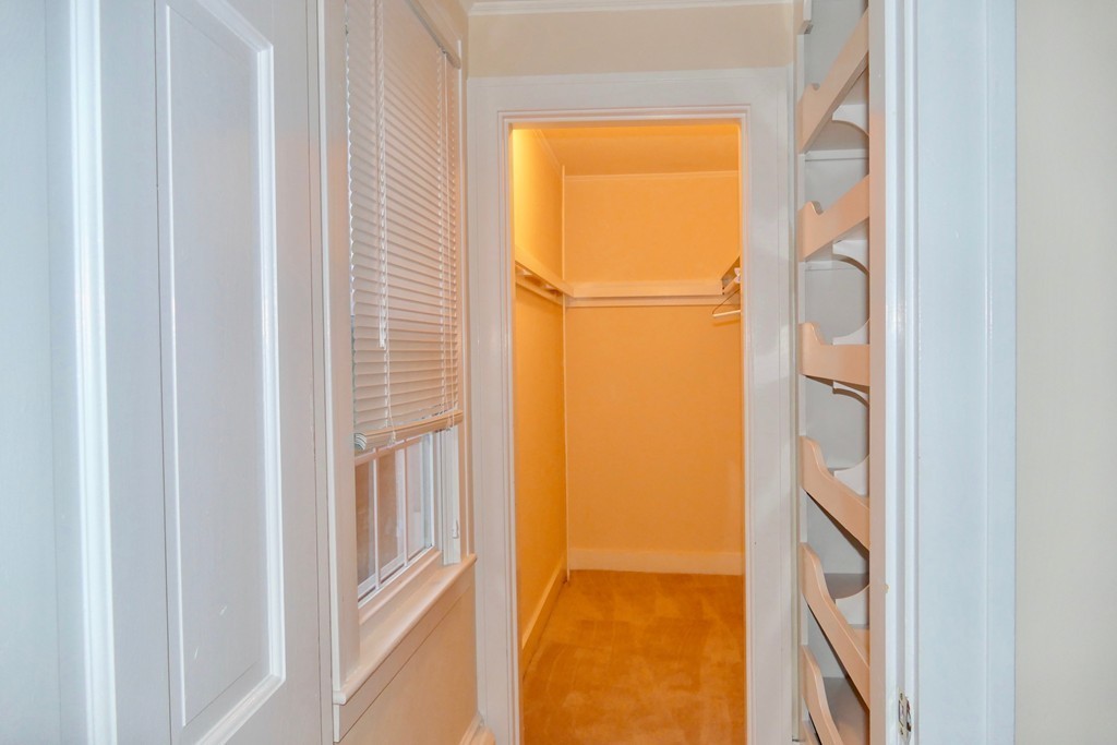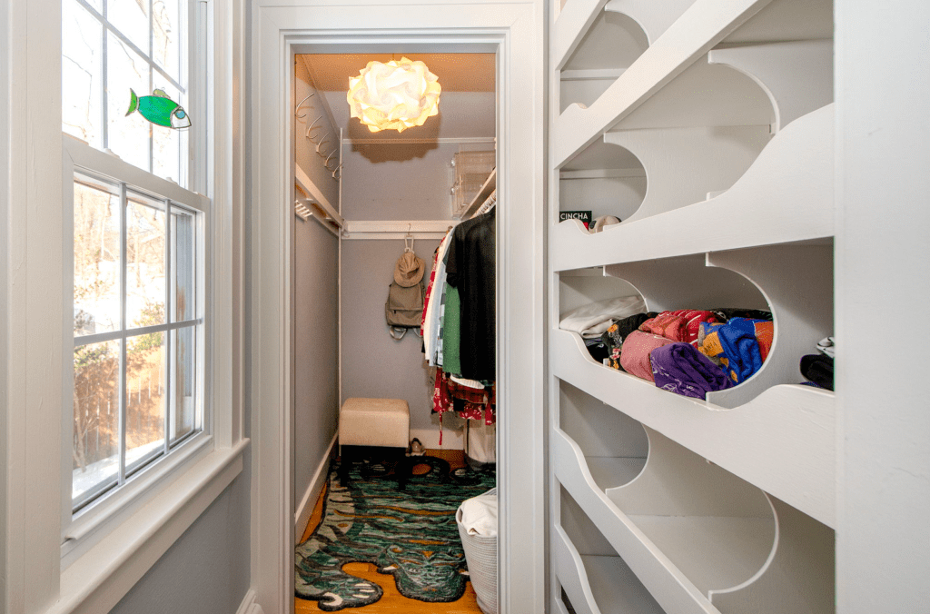 Some space had been borrowed from her at some point to create the 2nd closet in the primary bedroom, so it’s kind of an awkward layout, but it’s also fairly versatile and the resulting recess makes for a nice reading nook overlooking that beautiful west lawn.