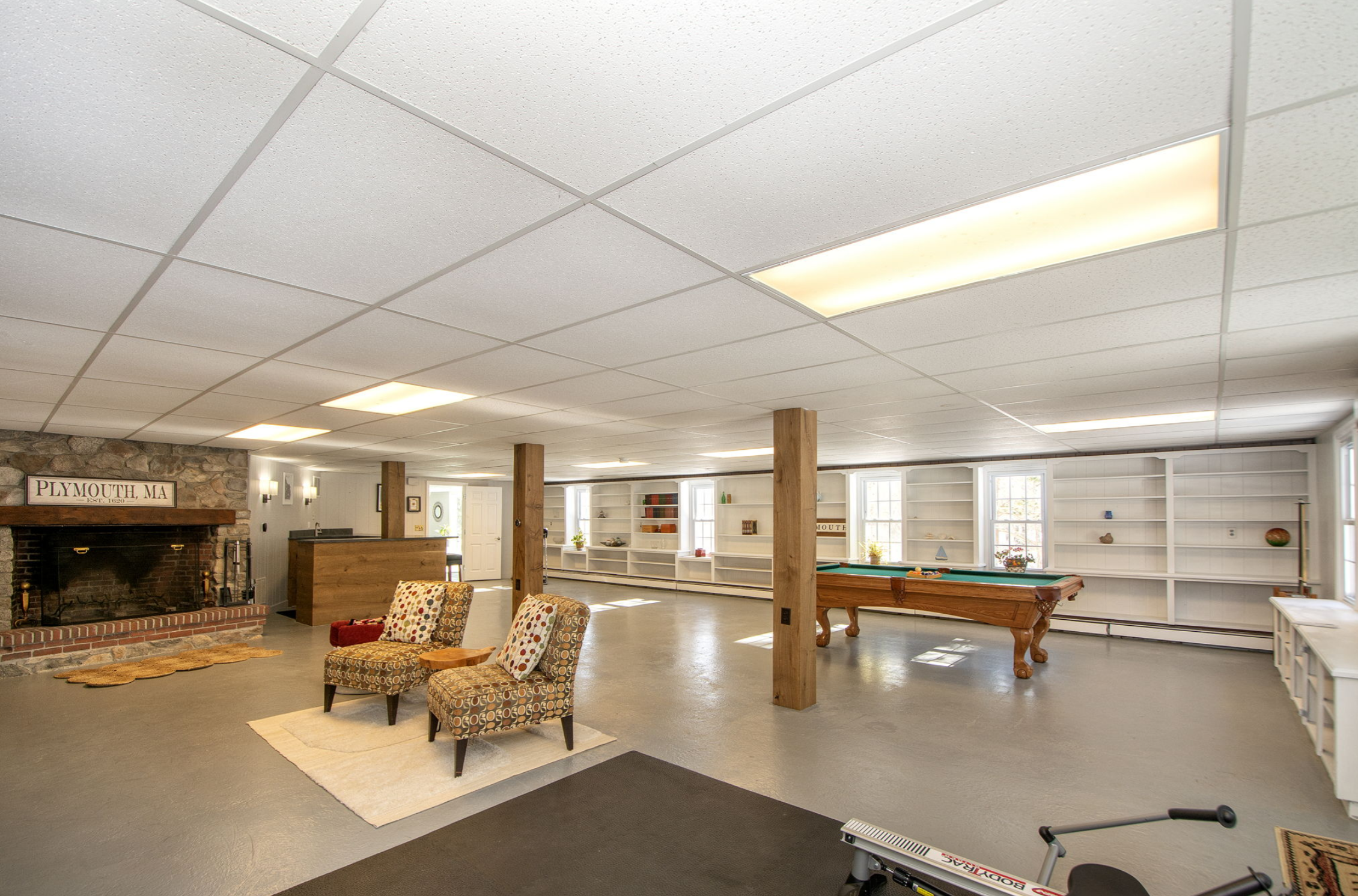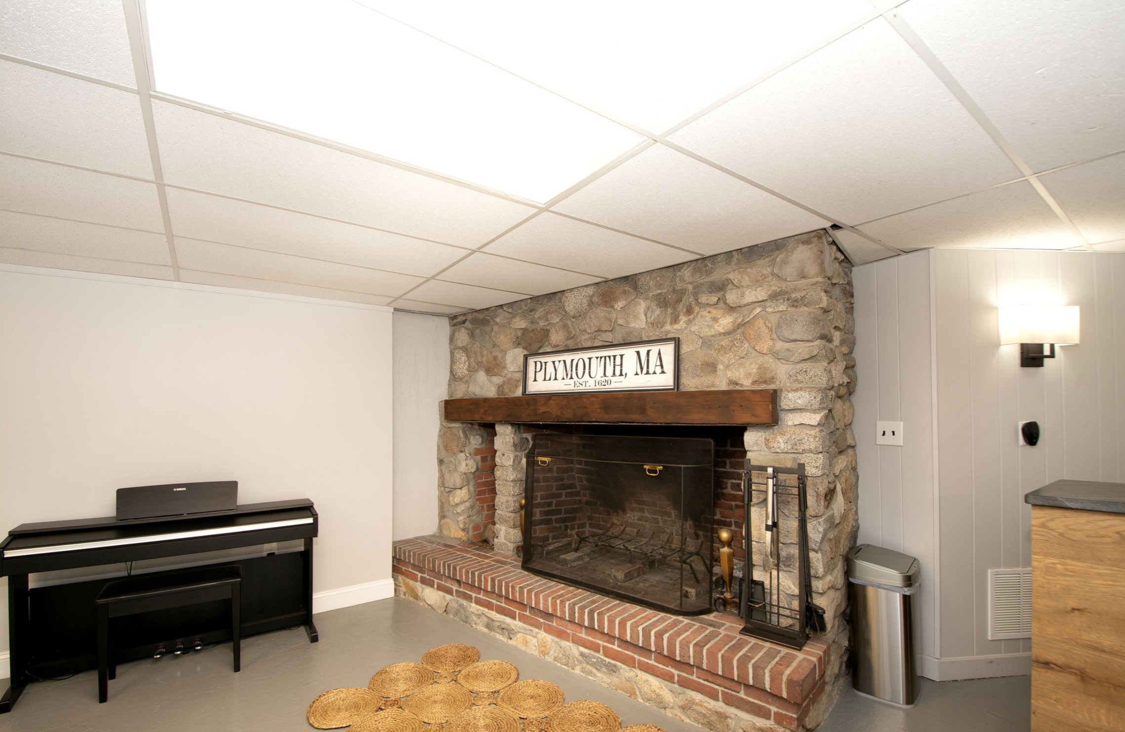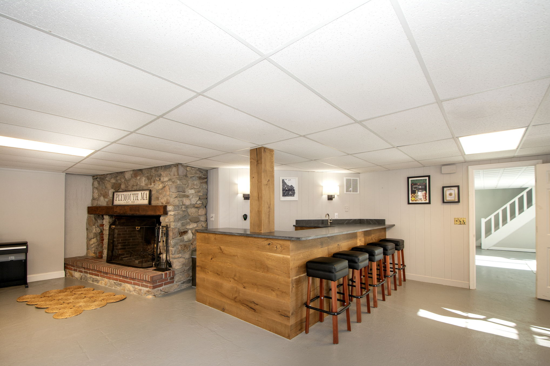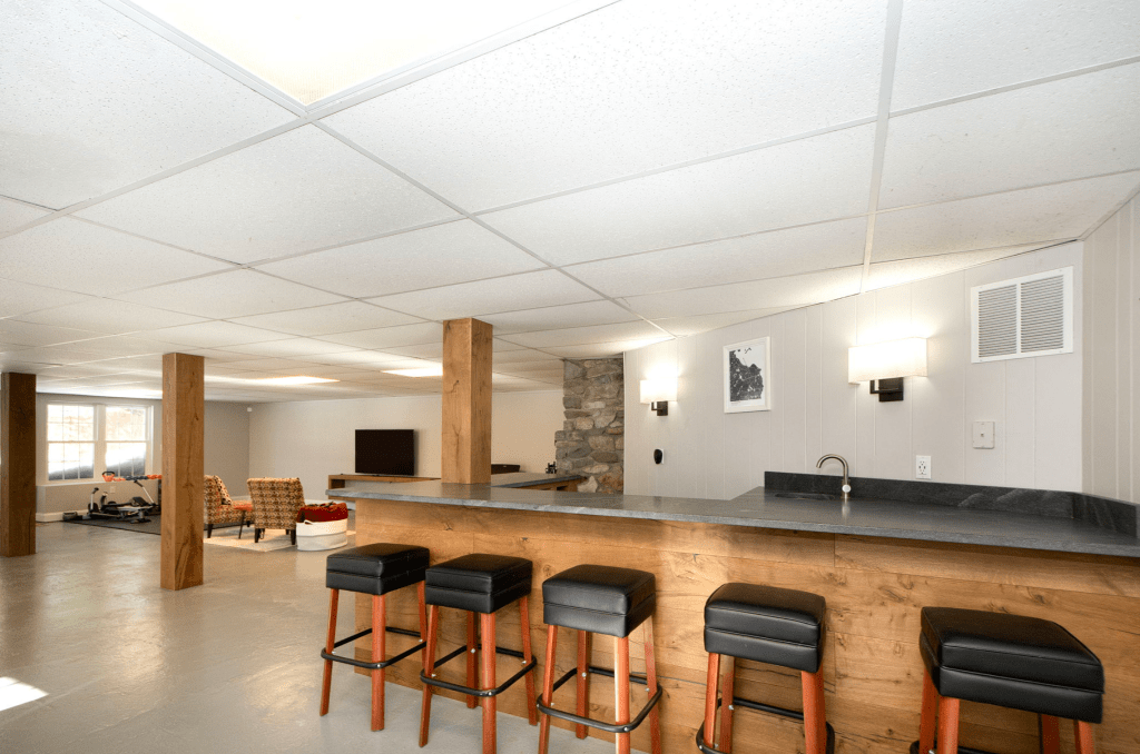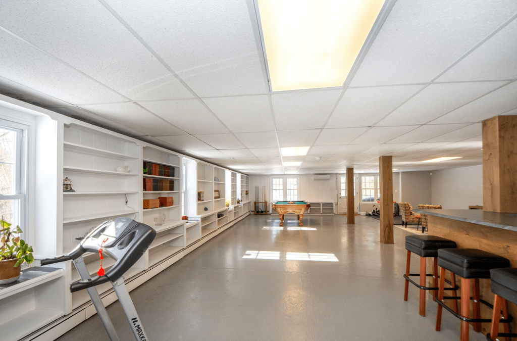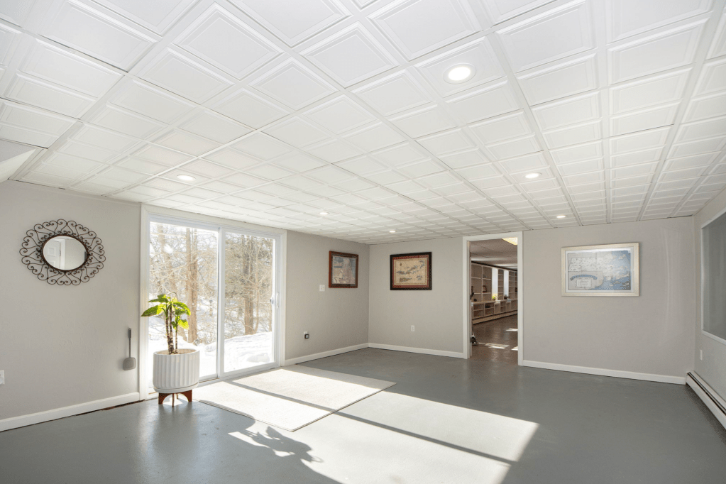 In the causeway between the laundry stairs and the actual basement, which we call the Maps Room because all of the art pieces hung there were maps, we repainted everything and replaced the ceiling tiles. In the basement proper, we updated most of the ceiling tiles and zhuzhed up the entire room.