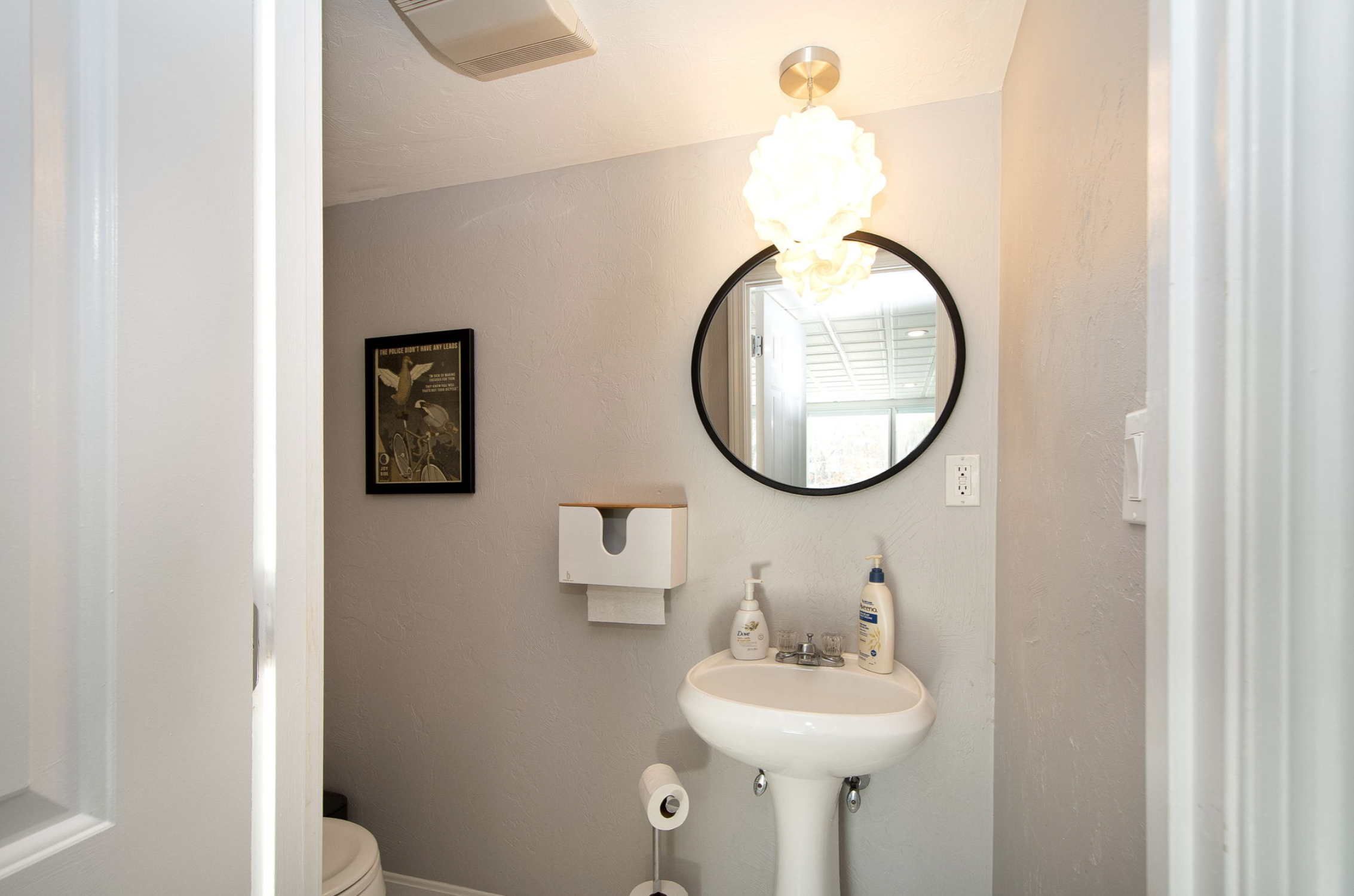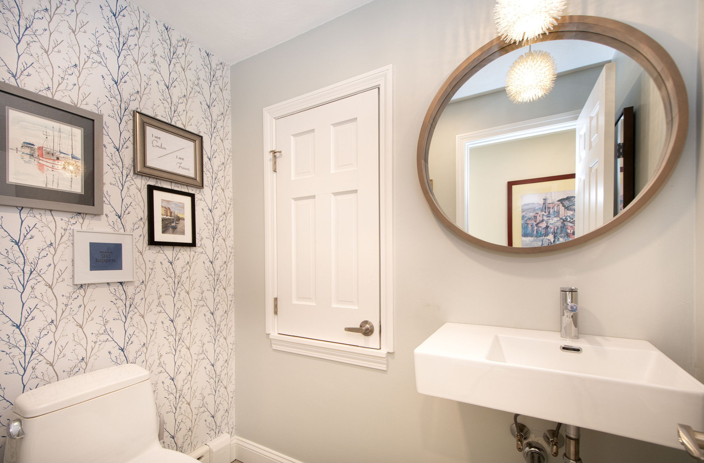 In addition to replacing everything (light fixture, fan, mirror, sink, toilet) in the main floor 1/2 bath, we also gave her a fresh coat of paint, and papered one of the walls for accent.