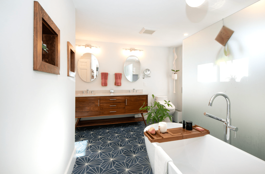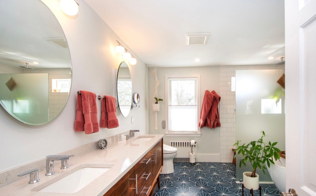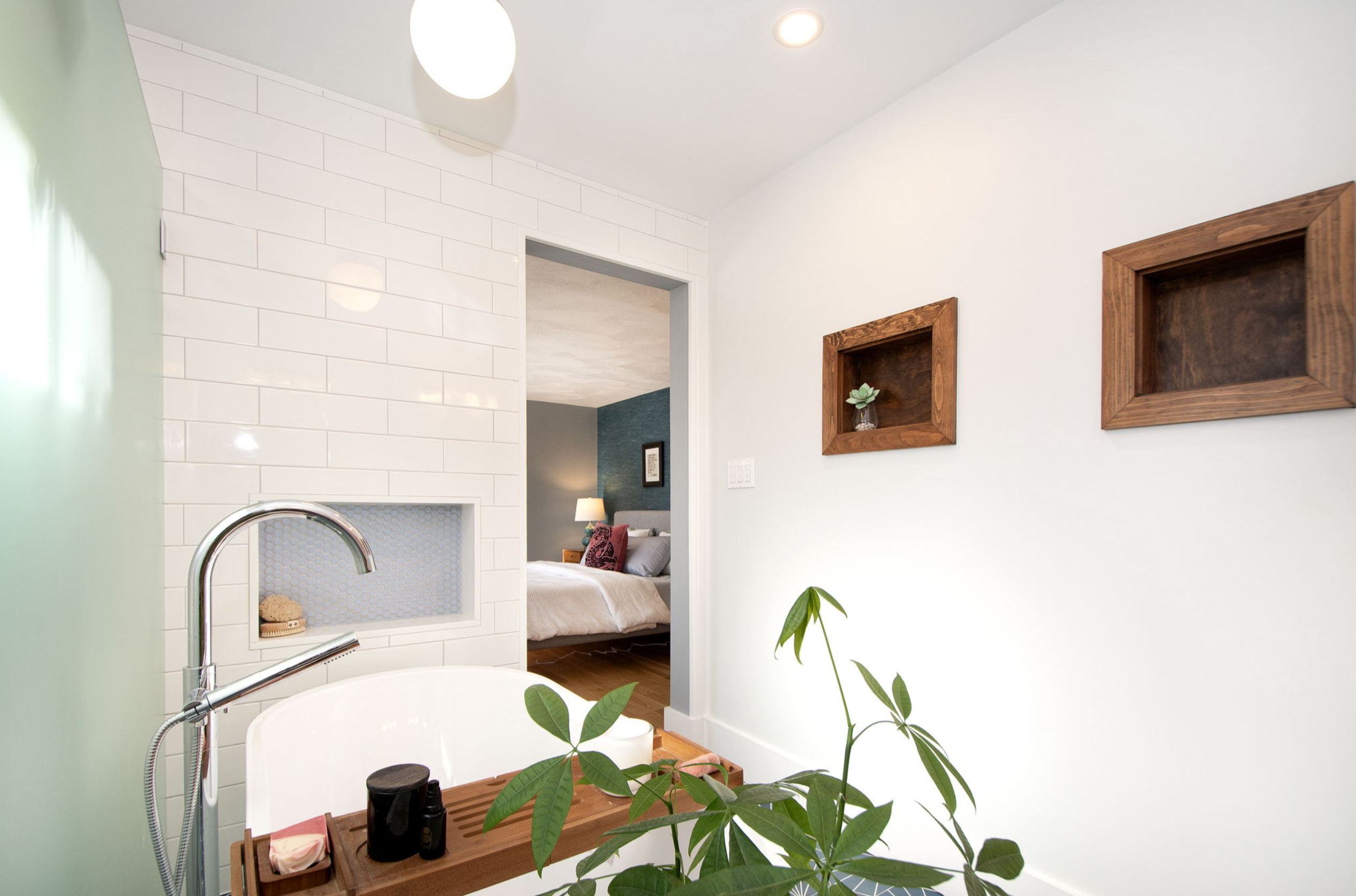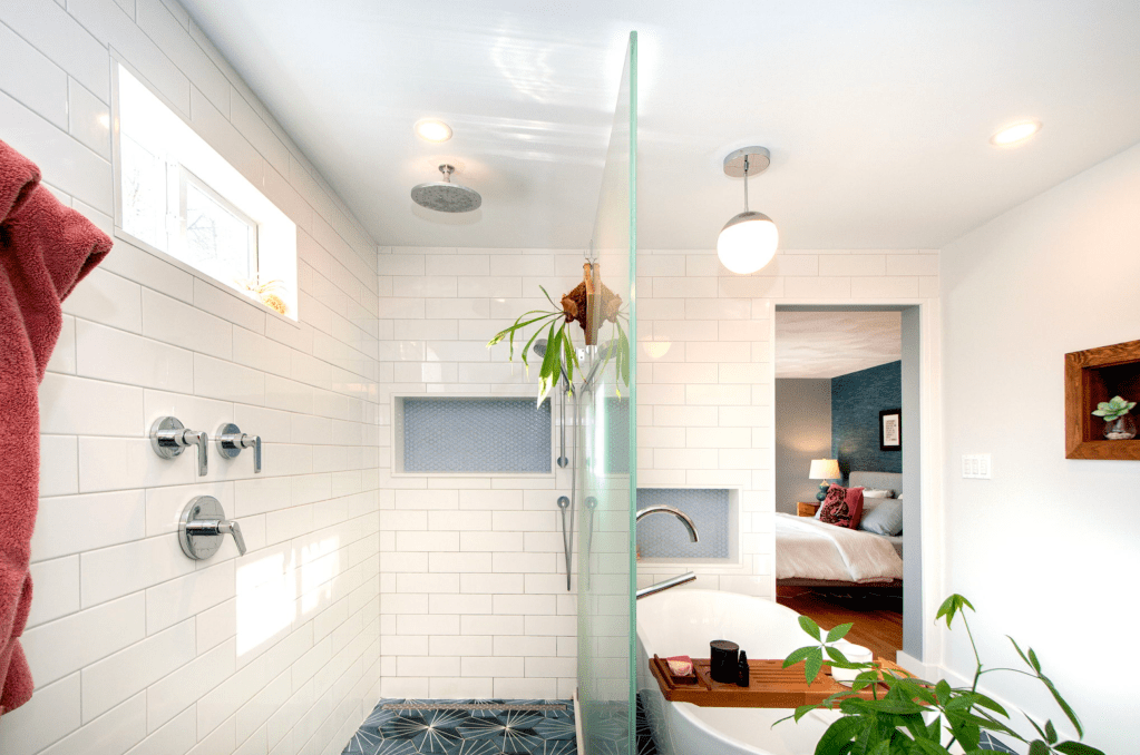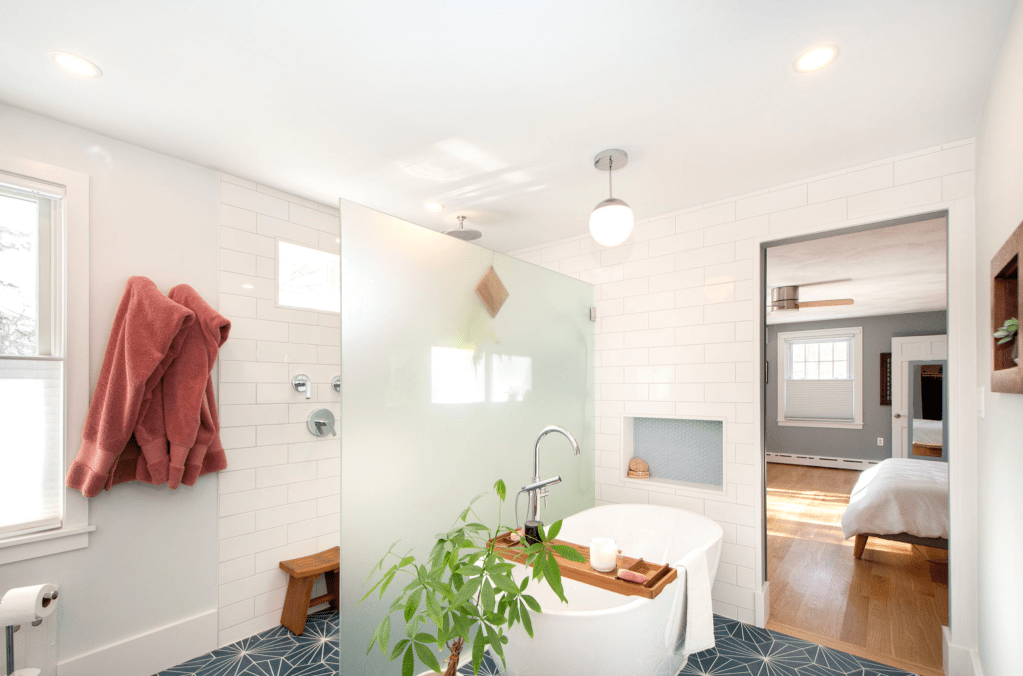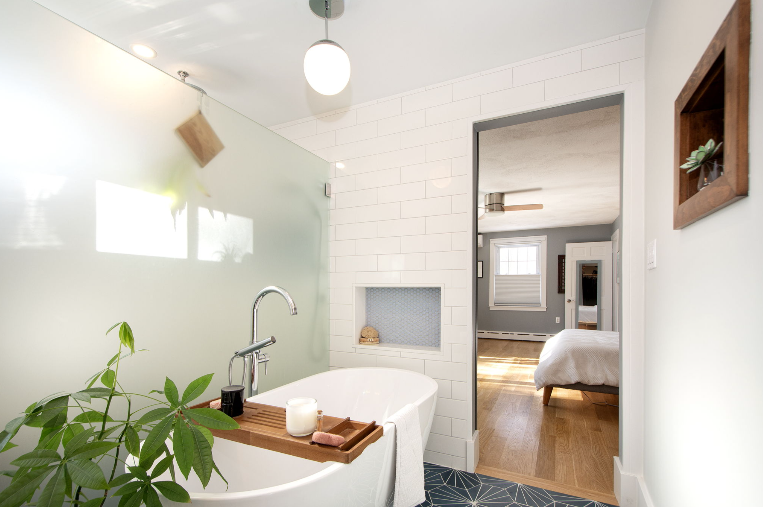 So … we borrowed a couple feet from the adjacent bedroom and closet – by doing so we expanded the passageway from the bath to the bedroom. We took it all down to the studs – removed the weird pink cast iron bath/shower thingy and the pony wall between the vanity and toilet, added a transom window on the south wall to bring in more sunshine – we even replaced the existing window above the toilet to increase energy efficiency. Then we created a curbless shower with an infinity drain and for privacy installed a frosted glass partial wall to maximize the sunlight in the room. We added a freestanding tub with its own dimmable pendant light to enhance relaxation while soaking, and then installed a stylish sliding door to gracefully avoid the bathtub. Sun-loving greenery adds the finishing touch. Here’s the result: