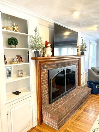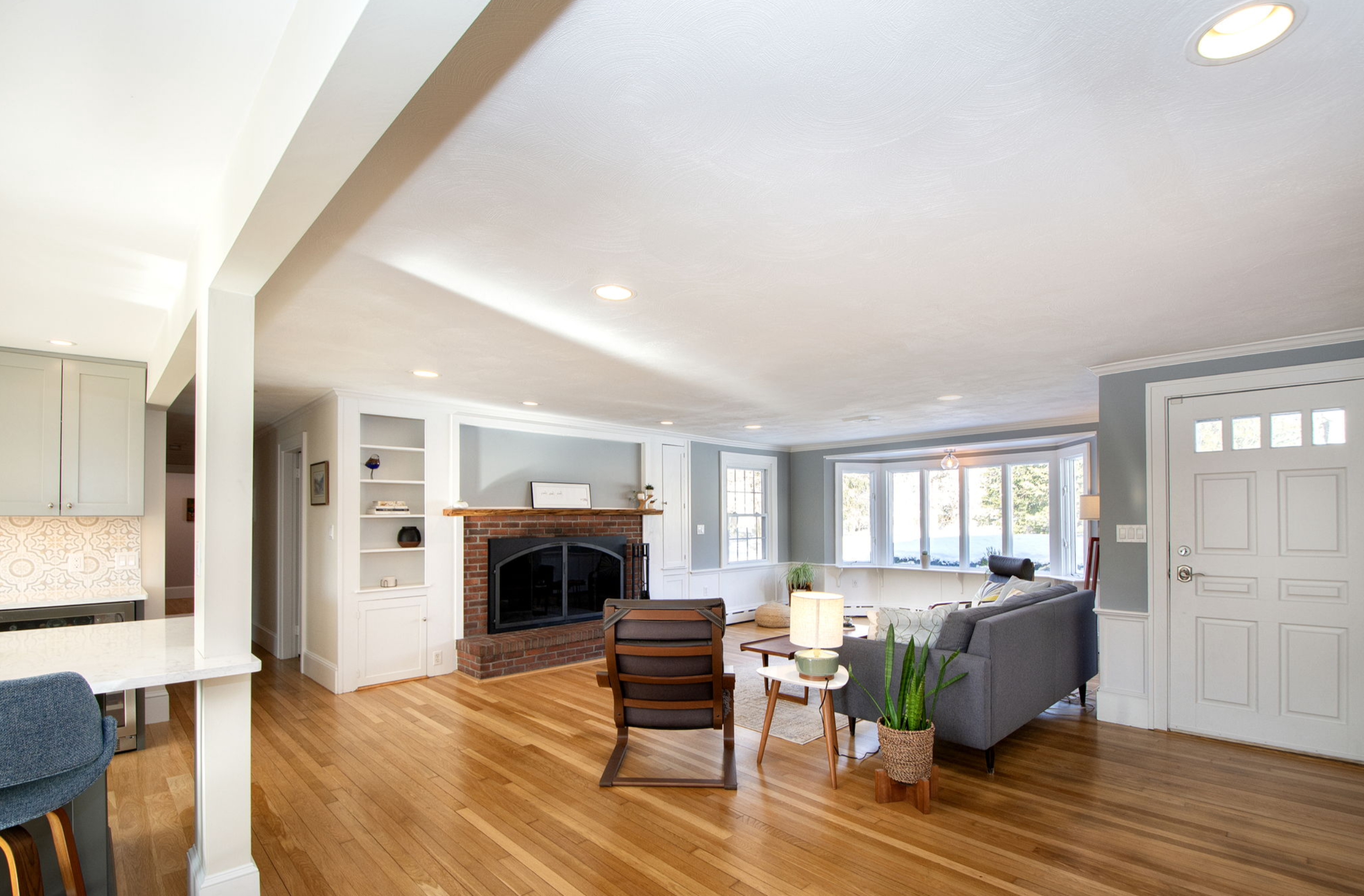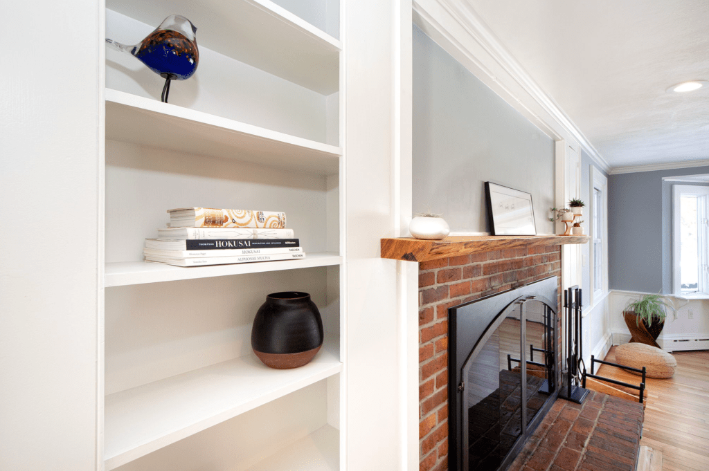 We replaced the bay window ceiling with beadboard and installed a new light fixture. We added more light fixtures and HVAC ducting in the LR ceiling. Then we cut out the ornate trimmings on the built-ins surrounding the fireplace, bringing it into the 21st century. And, again with the help of my talented carpenter of a neighbor, I took another live edge wood slab and crafted a custom mantel. With that installed and cleaner moulding fastened around it, the fireplace now stands out as a modern, attractive gathering place in any season.