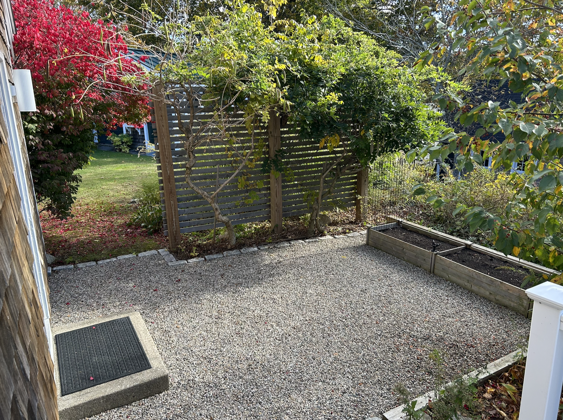 When we bought Cape Casita, there was a chainlink fence in the back yard as a support for the beautiful vines at left, and a clear (if overgrown) view to the neighbor’s yard. So we took the chainlink down, and then, in order both to support the vines and afford a little privacy, we built a trellis, leveled out the patio area and added gravel to make it uniform, and finally installed a raised garden bed to take advantage of all the summer sunshine the area enjoys.