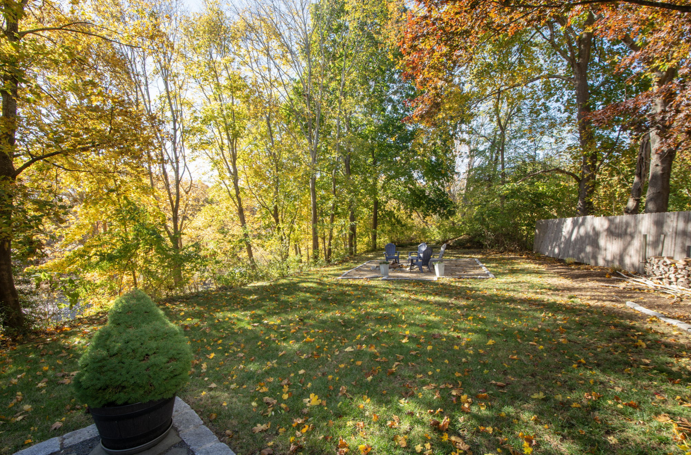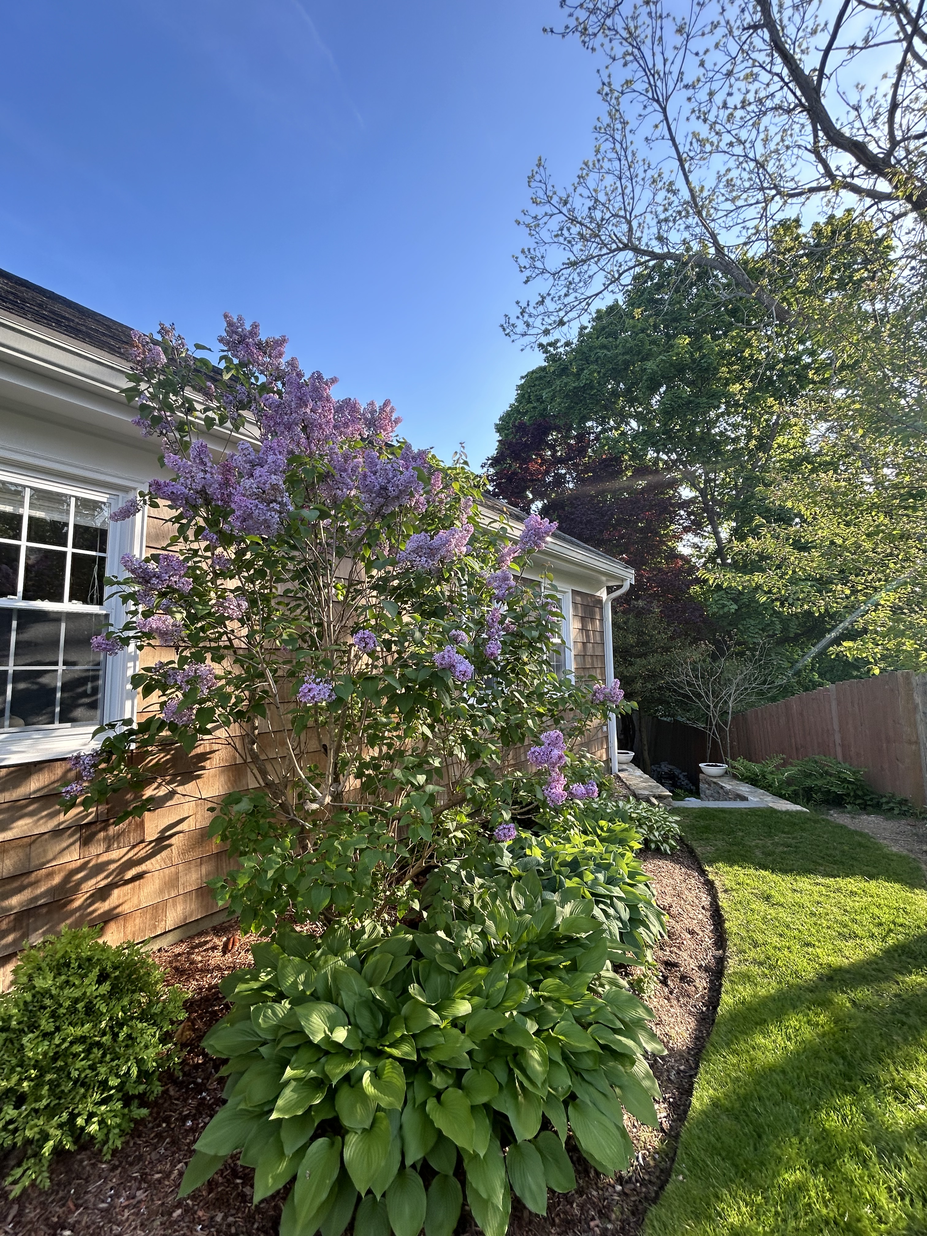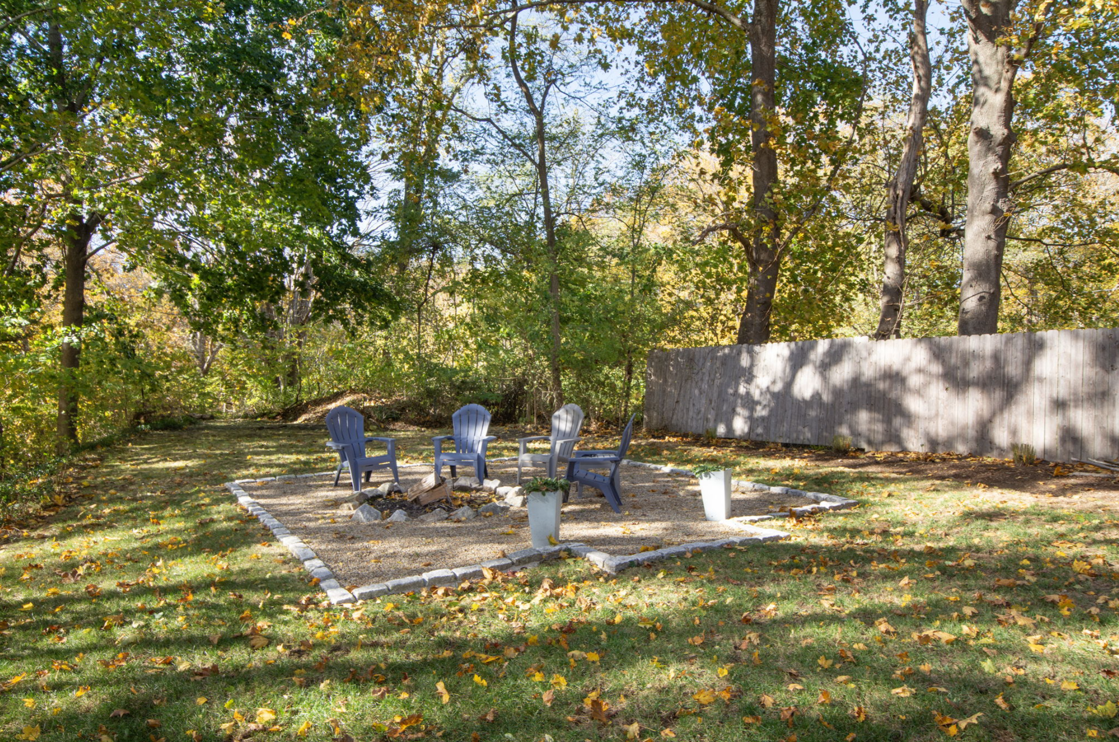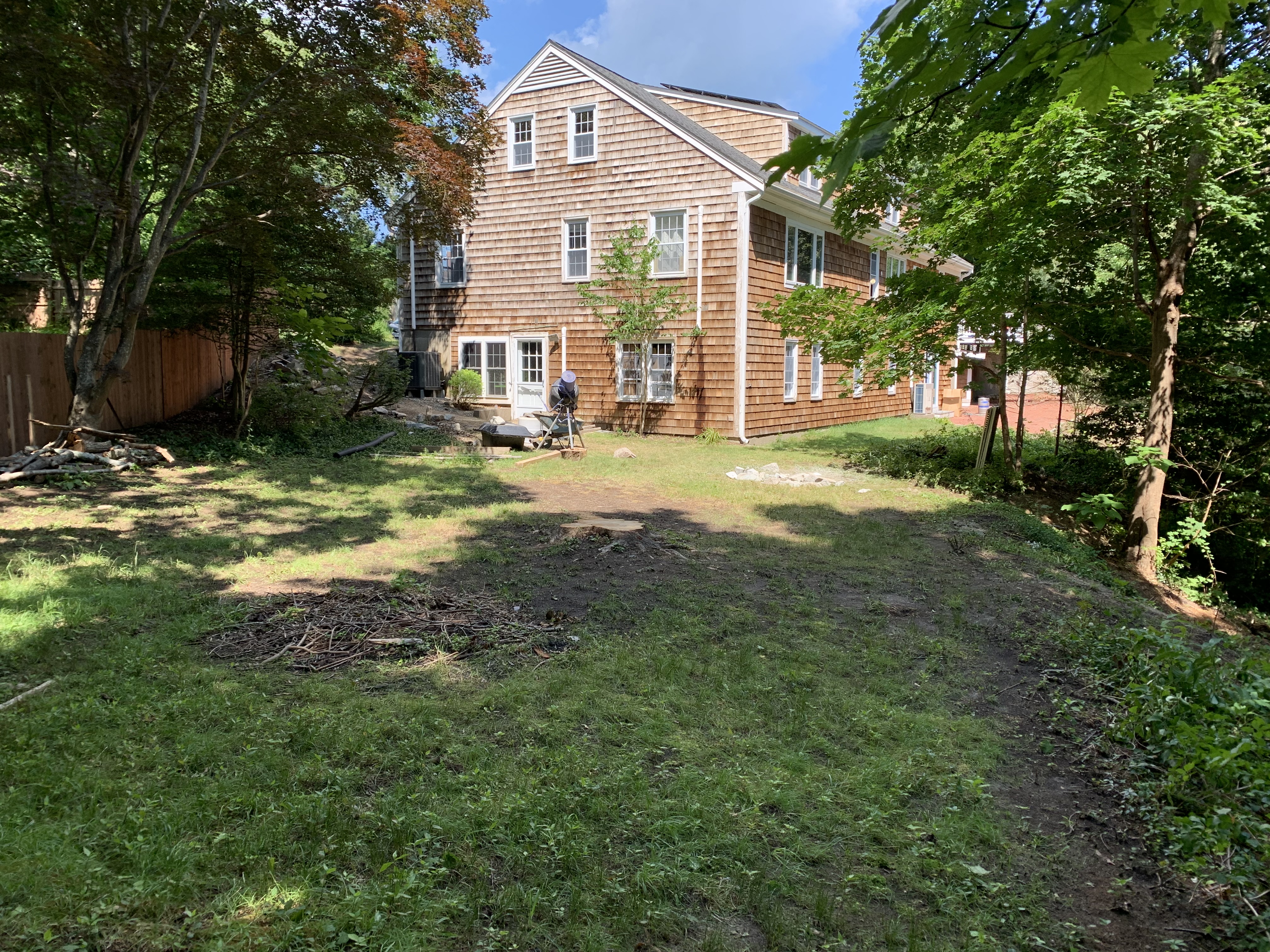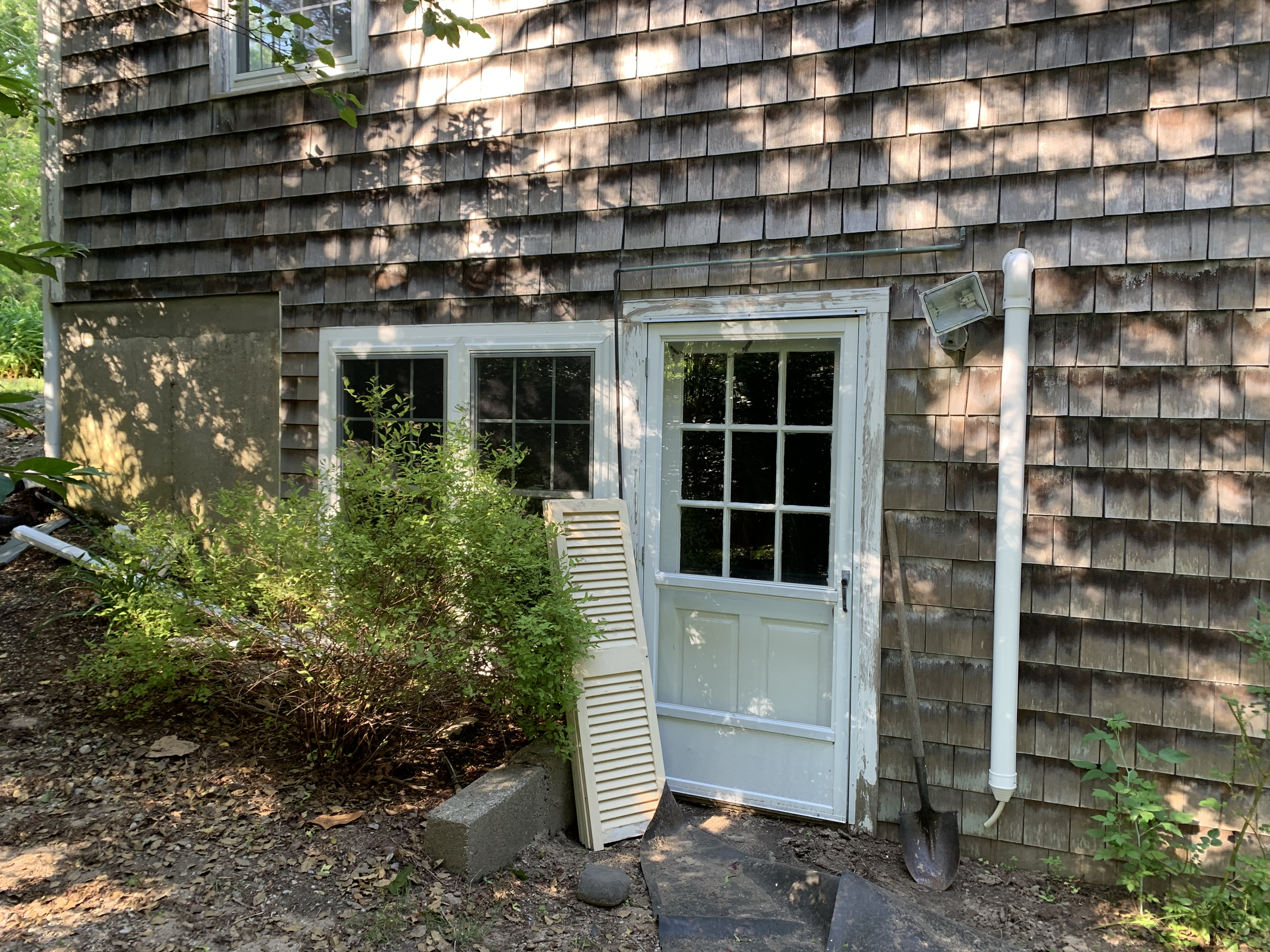 The siding on the western wall of the house had been neglected for so long that by the time we got to it to try to power wash and stain it, it was too late. It was all potato chipping – warping and gapping and just not repairable. And the mud that had washed down from the front yard and built up at the base of the west wall created some damage. So we replaced the shingles which will last for another lifetime. Finally, we added a patio accessible from the west basement walkout, and a firepit to warm those chilly autumn evenings. The west lawn is now a beautiful haven, in every season of the year.