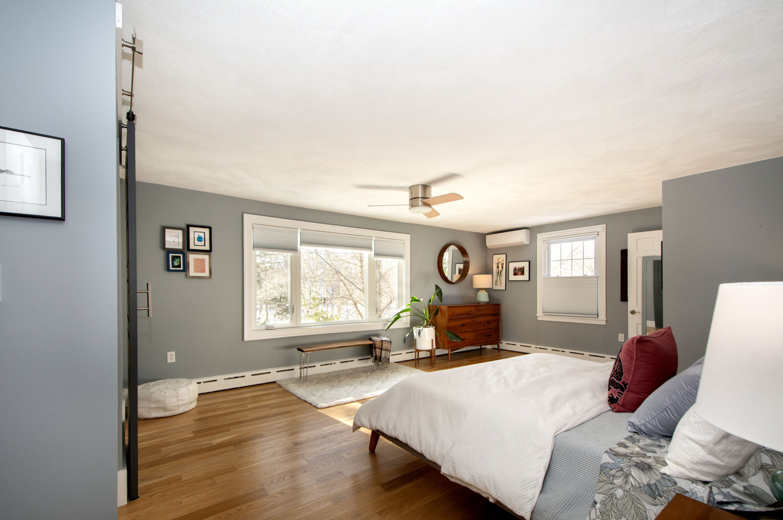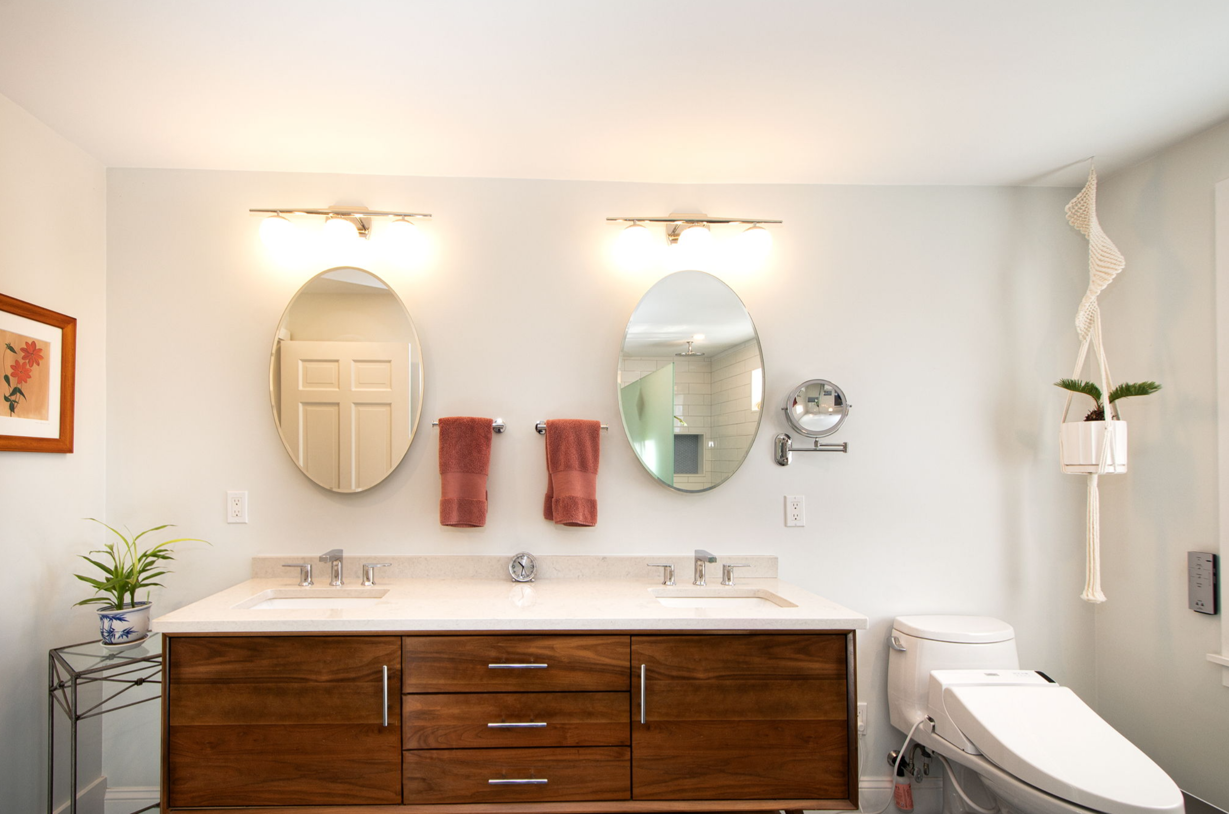 We expanded the primary bath on the main floor, converting the shower stall to a curbless entry with infinity drain, and adding a freestanding soaking tub, a custom walnut vanity, a washlet and mid-century mod finishes. We cathedralled the ceilings of both upstairs suites, gutted both baths, and refinished the wood floor in the primary upstairs bedroom. To bring in more light, we added transom windows to all three en-suite showers. No square footage was added, but it feels much more bright, expansive and open now.