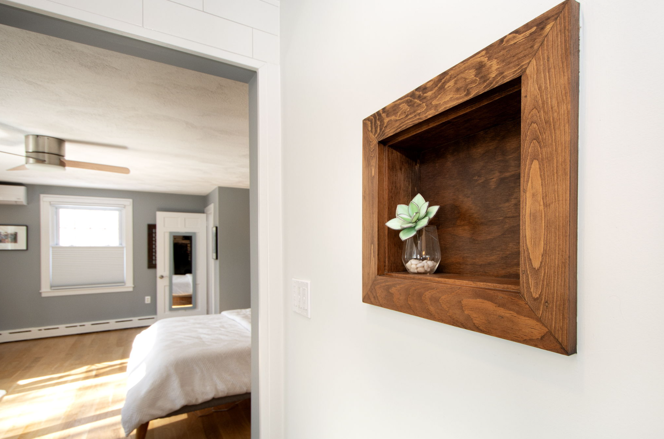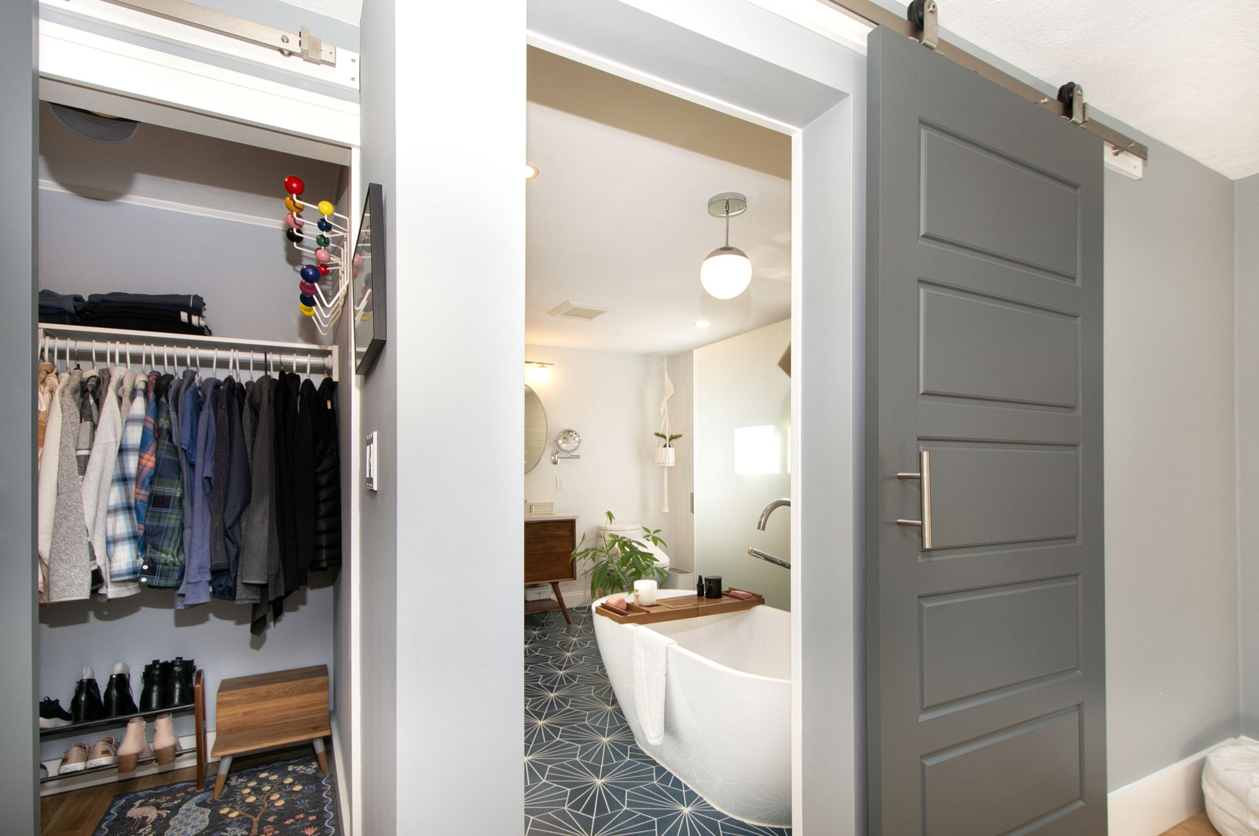 When we first found her, she was a carpeted expanse of beige, with a weird built-in dresser and no character whatsoever. But with 2 walk-in closets, that arresting view, and so much space, we could see her potential. We wanted to create a peaceful retreat from the world. I think we succeeded. (I made the bench beneath the window from a slab I picked up at a local live edge wood shop, and the help of my very talented carpenter of a neighbor!) Note that the sliding door to Closet Two matches the one to the bathroom. <wink!>