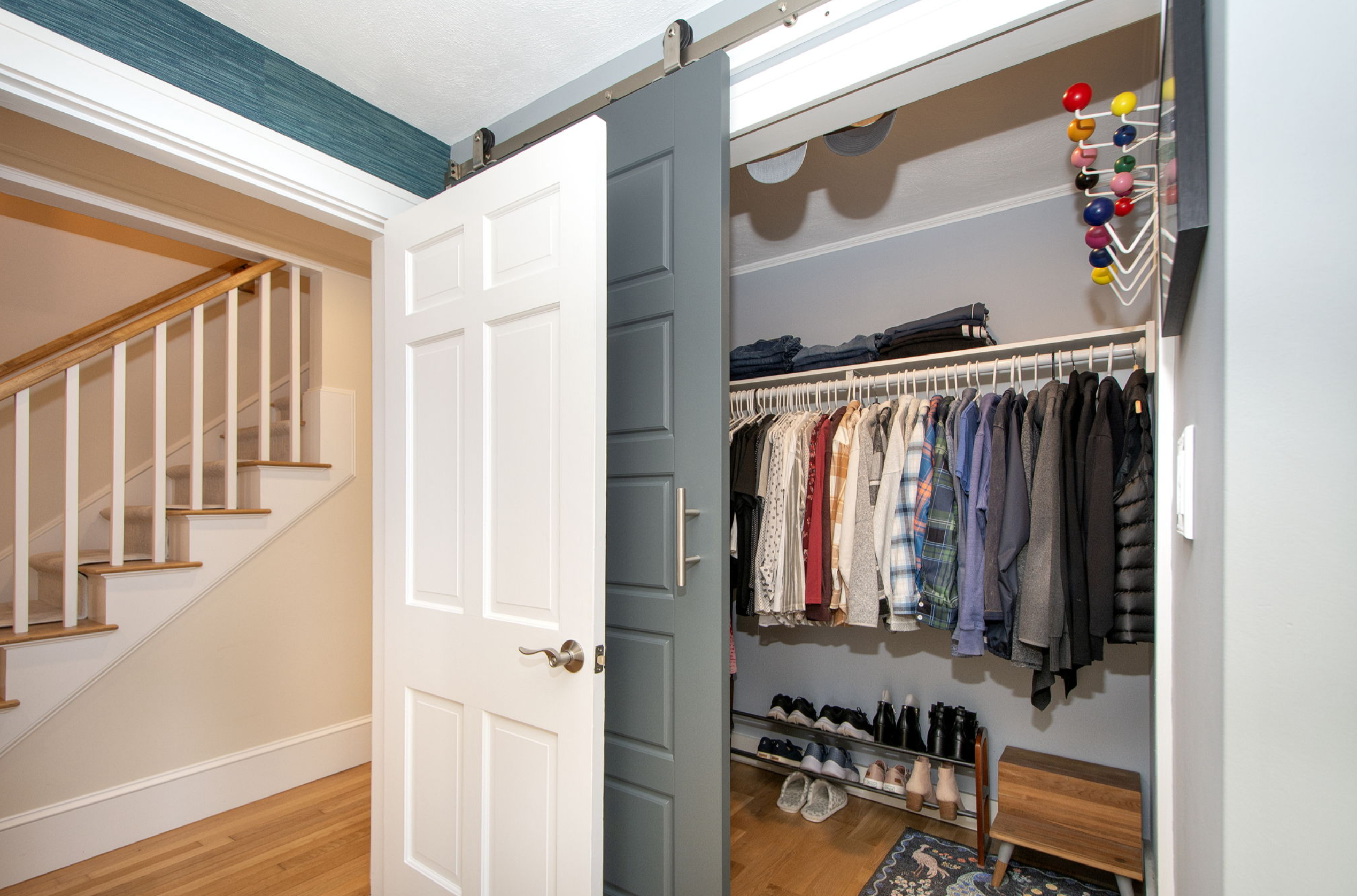 The former stairwell between the main and upper floors was, in a word, precarious. It was locked off, curved, narrow, and steep – definitely not “to code”!! (I really wish I could find a picture of it in full. Seriously, you have no idea.) We had an architect help us design an update to it, which naturally led us to another challenge: the landing. Now, normally, that wouldn’t be such an issue, but in this case, of course, the radiator is RIGHT at the top of the stairs, and right in front of it is the entry to a super handy attic storage space. SO. Our very clever GC devised a super innovative solution: he left the door where it was, and cut an almost-unnoticeable opening in the railing where you can enter from a stair below the landing. 🤯🧐 Oh and the new stairs are GORGEOUS (besides being safe)!