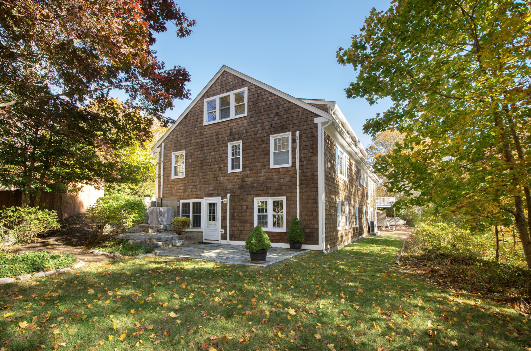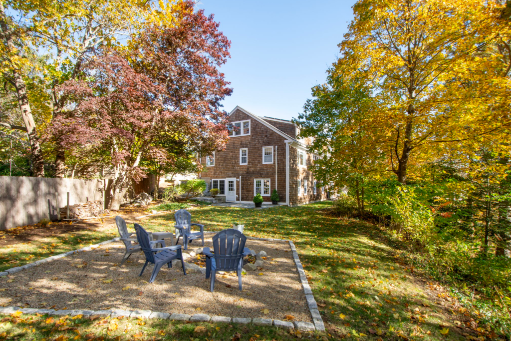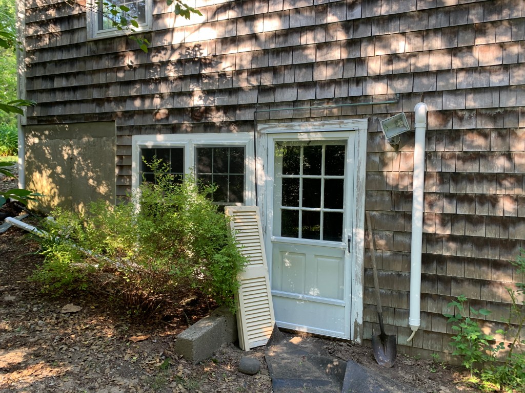 Let’s start with curb appeal! Originally the house had traditional cape-style shutters and warped, greying shingles. We removed the shutters, power-washed & stained the shingles, and painted the exterior doors. To mitigate flooding, we added a granite apron across both entries to the driveway, effectively driving water streaming downhill into drains.