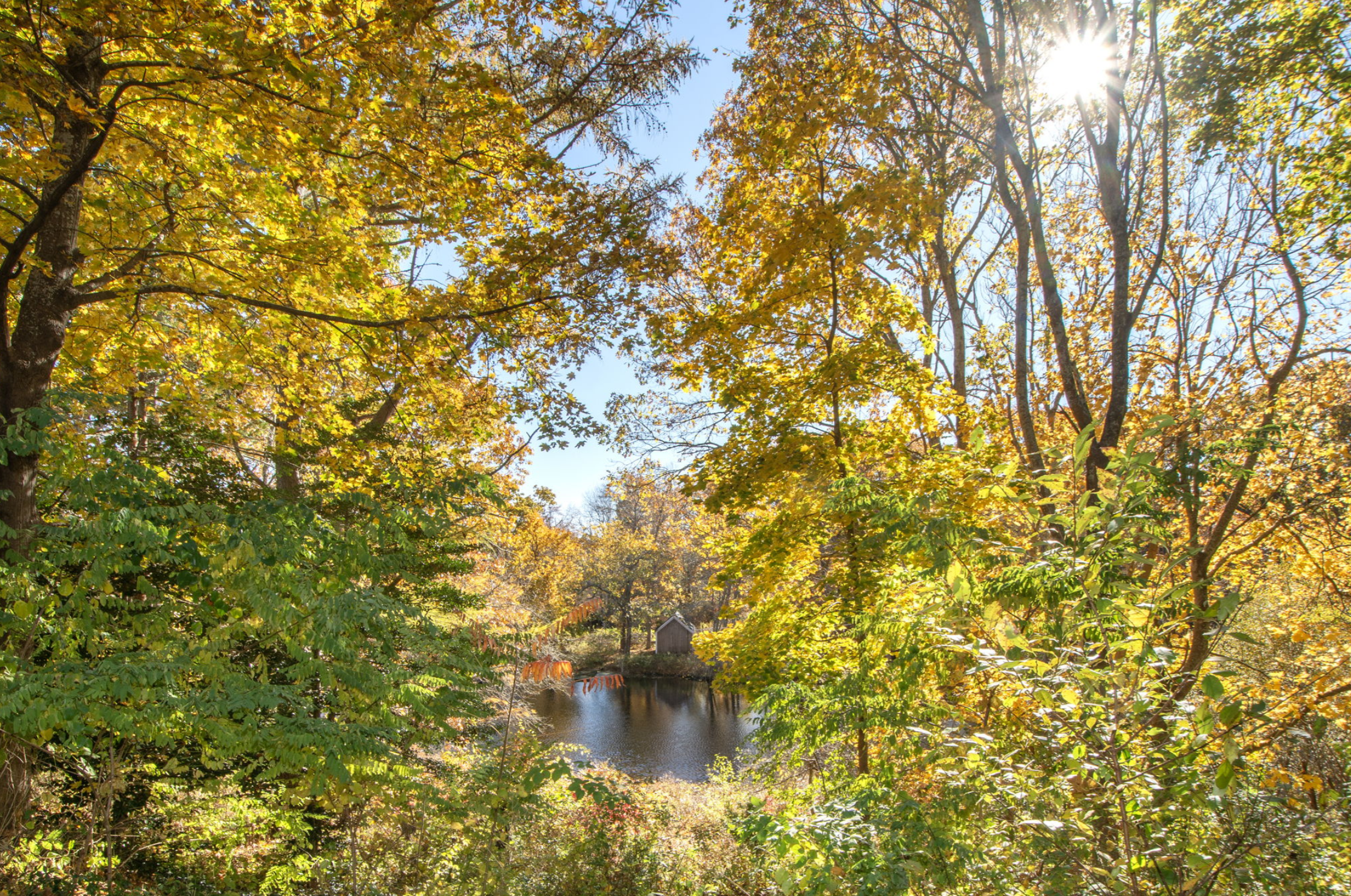 Now, the kitchen was a TRUE transformation. It was boxed in by a wall of cabinets, the range wasn’t vented, there weren’t very many windows, the tile was ugly and not well installed, and it was just generally cramped and outdated. By knocking out the wall between kitchen and LR, opening a sliding door to a (future) deck, installing a 10’x4′ island with built-in shelf microwave, and updating the lighting, it’s much brighter and more expansive. We tiled the backsplash on both sides of the room so that it all ties together. We installed wider plank wood flooring but stained it to match the rest of the house so it blends seamlessly. Looking south out of those beautiful new windows toward the adjacent pond, it really feels like you’re in a treehouse. And now, instead of a divided DR, LR and Kitchen, there’s a true, cohesive Greatroom, with light, flow, and continuity.